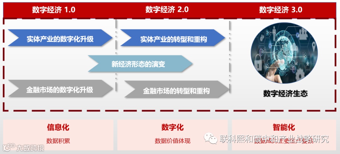 到数字经济3.0的阶段,不仅会有实体和金融的融合,现有产业的边界都会变得模糊,最终形成新的产业分类,这就是未来的数字经济生态,整个数字经济阶段和路径可以用图5简单的展示。