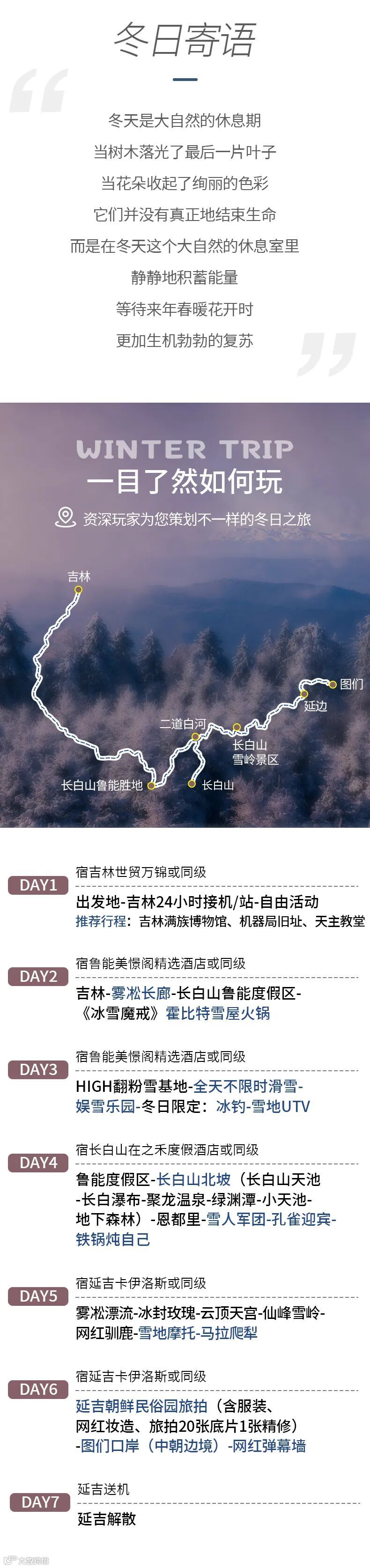 雾凇漂流-冰封玫瑰-云顶天宫-雪岭漫步(62KM,车程约1.5小时)-雪地摩托-马拉爬犁-网红驯鹿-延吉(118KM,车程约2.5小时)