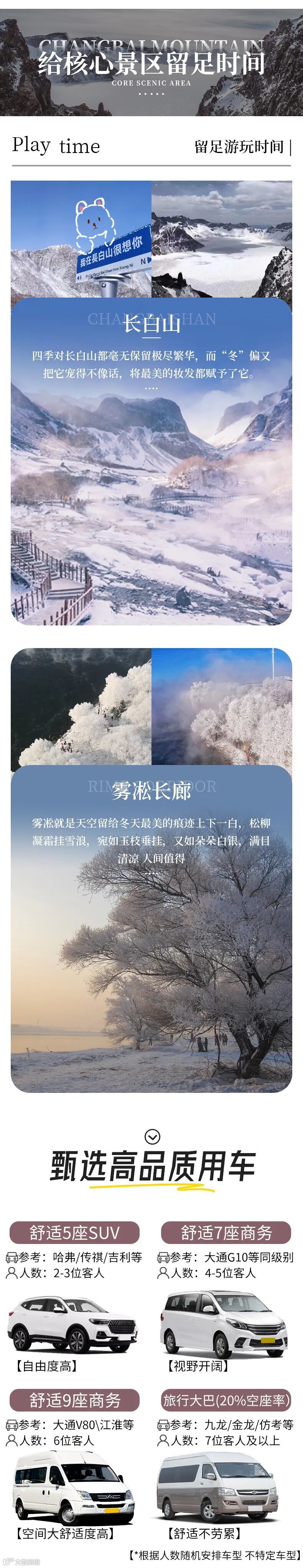 4、长白山景区由于最新政策需要预约,每天限流参观,团队参观时间严格按照预约场次进行;因此,景点参观顺序会按照预约时间进行调整或同团客人安排不同时间游览,敬请配合。如未能预约成功,无法安排游览,我们将调整行程前往游览“雪山飞湖”景区(退差价),望您谅解