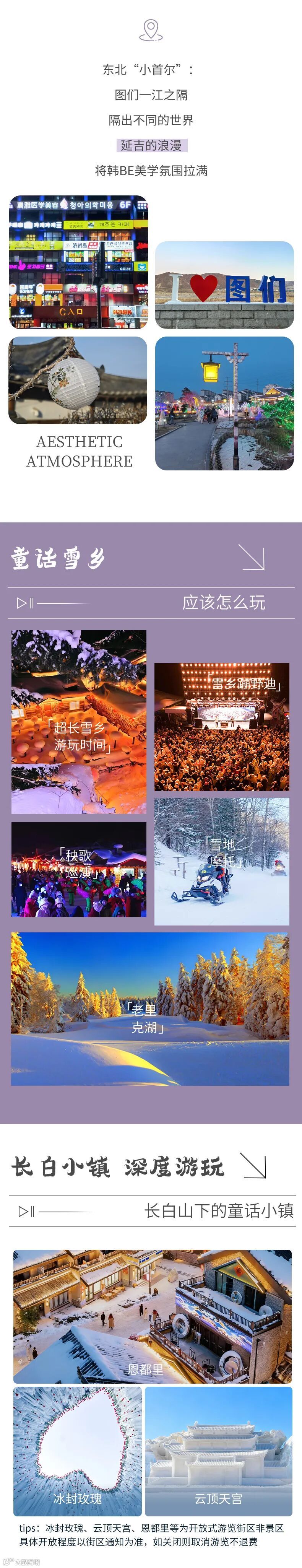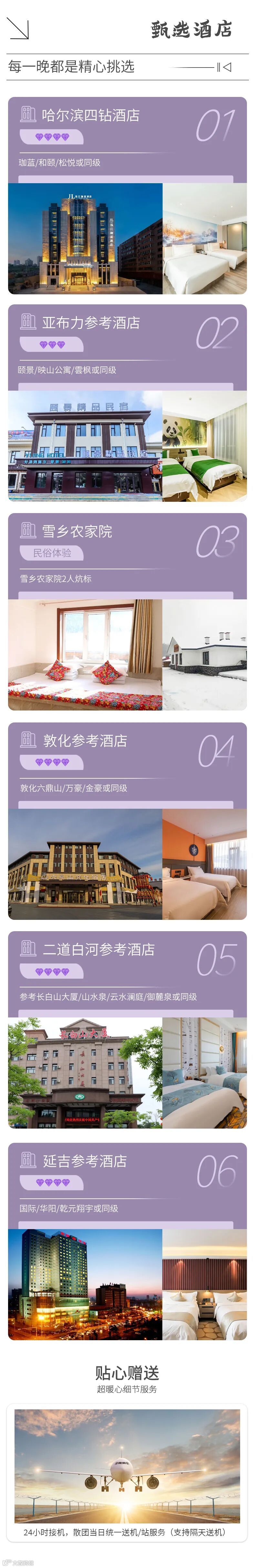 4、门票:亚布力2小时滑雪包含雪鞋雪板雪杖使用、雪乡门票+往返环保车、长白山门票+区间车+往返环保车+倒站车、雪地漂流门票、朝鲜民俗园门票、老里克湖门票、图们口岸门票;