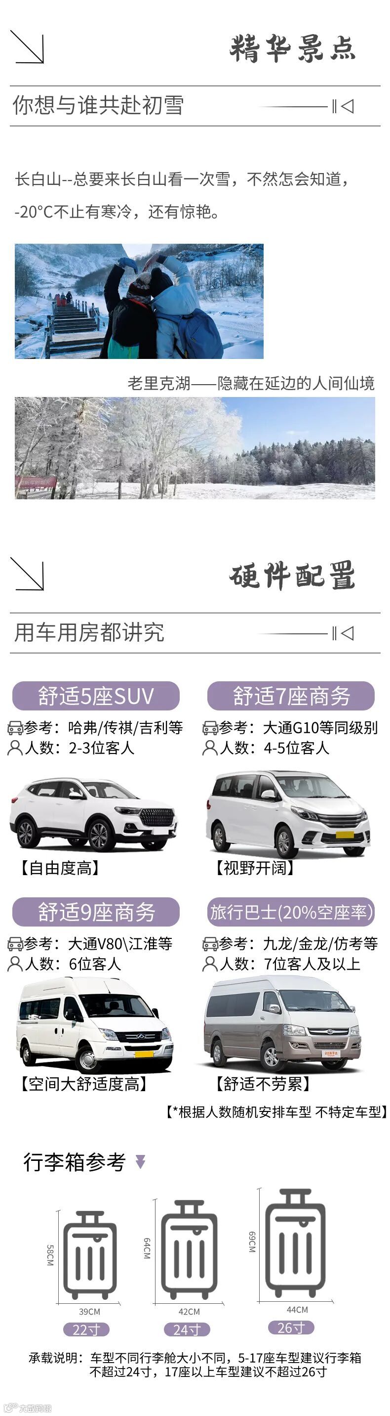 4、长白山景区由于最新政策需要预约,每天限流参观,团队参观时间严格按照预约场次进行;因此,景点参观顺序会按照预约时间进行调整或同团客人安排不同时间游览,敬请配合。如未能预约成功,无法安排游览,我们将调整行程前往游览“雪山飞湖”景区(退差价),望您谅解。
