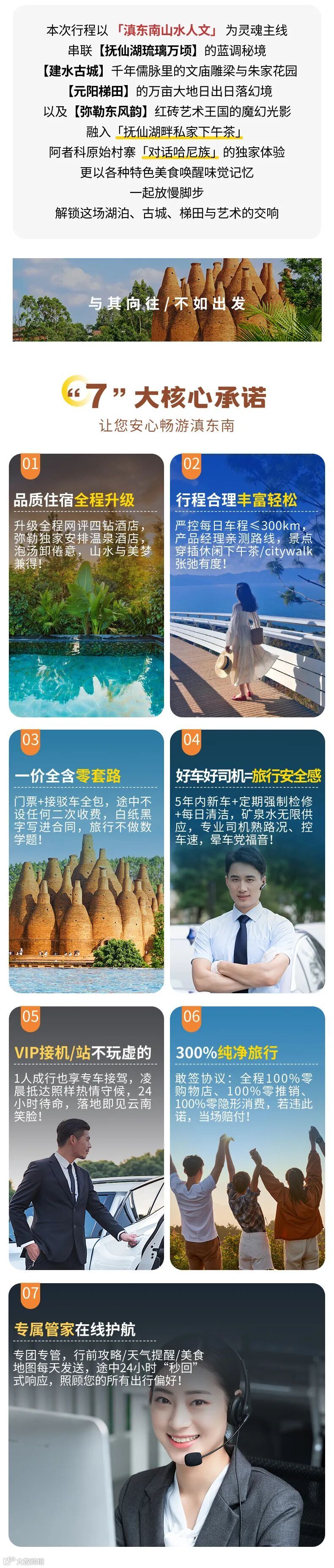4、门票:抚仙湖禄充景区,下午茶,建水文庙,朱家花园,团山民居,元阳景区,阿者科民俗村,东风韵景区;