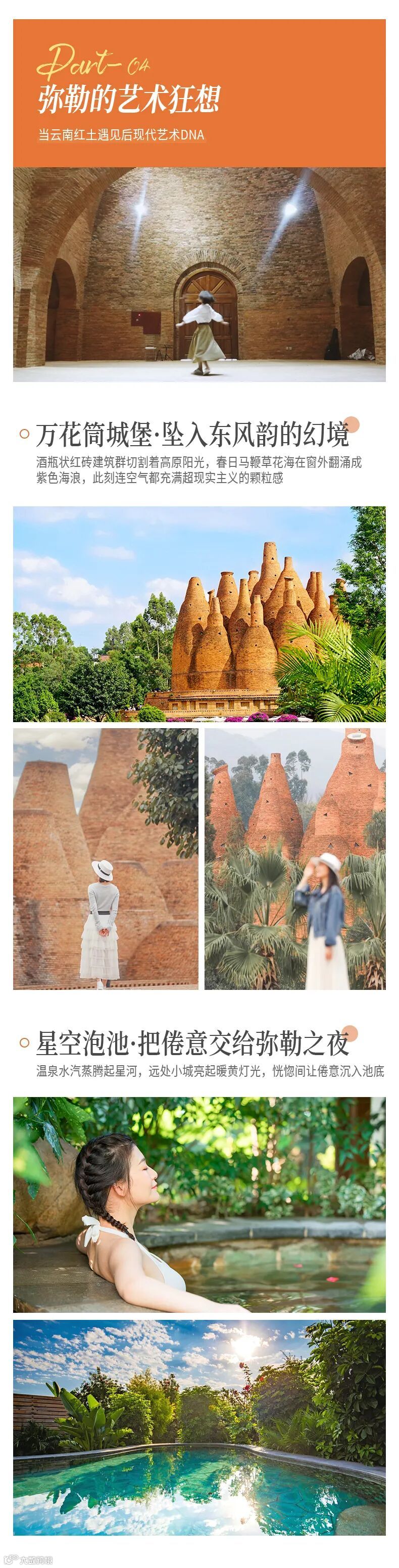 09:00 前往网红打卡地【东风韵小镇】,这是一个集休闲度假、佛教文化、民俗体验、生态观光于一体的艺术小镇。景区内建筑是以本地生产的红砖为主,将三种当地文化混合其中,十分具有设计感,其中酒瓶状建筑代表的是弥勒的红酒文化,还有彝族的火文化和共生向上的文化。