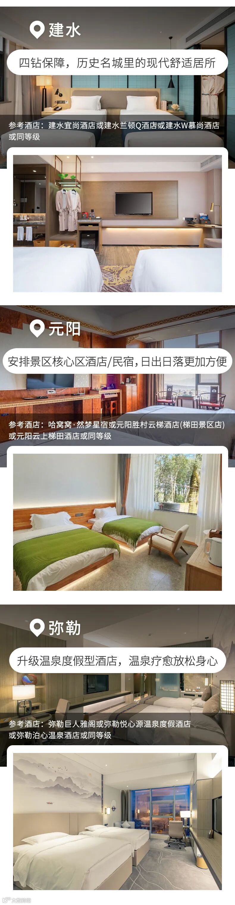 1、住宿:昆明四钻酒店1晚(参考:龚禧里·禧见酒店或枫渡酒店(昆明站官渡万象城店)或同等级酒店),建水四钻酒店1晚(参考:建水兰顿Q酒店或建水W慕尚酒店或同等级酒店),元阳三钻民宿或四钻酒店1晚(参考:元阳胜村云梯酒店(梯田景区店)或哈窝窝·然梦星宿或同等级民宿/酒店),弥勒四钻酒店1晚(参考:弥勒巨人雅阁酒店或弥勒悦心源温泉度假酒店或弥勒泊心温泉酒店或同等级酒店);