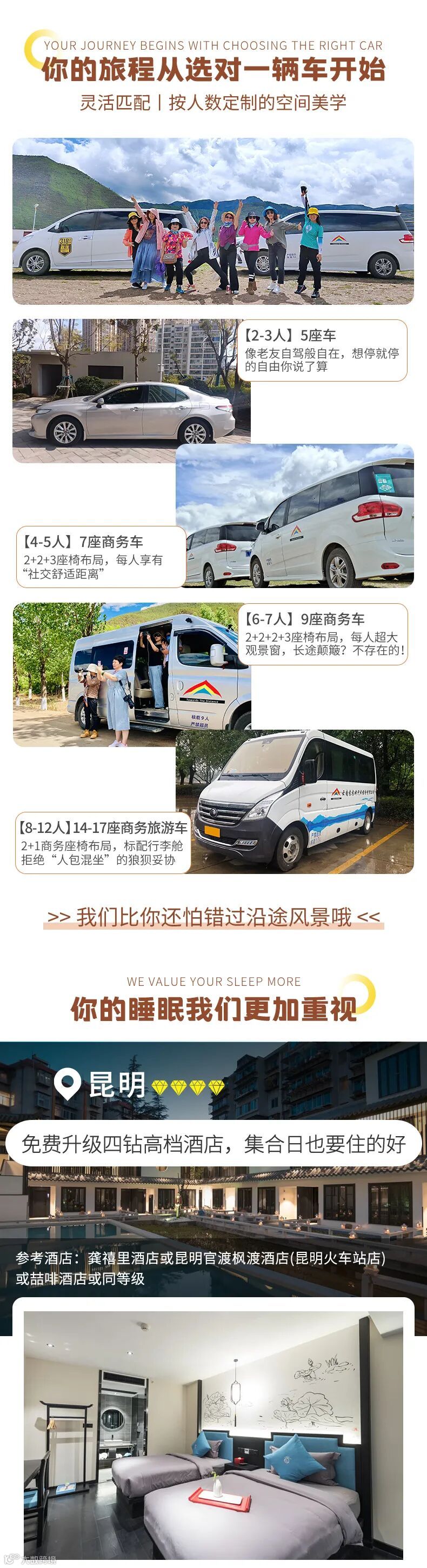 3、用车:2-3人安排5座车,4-5人安排7座商务车,6-7人安排9座商务车,8-12人安排14-17座2+1旅游车;