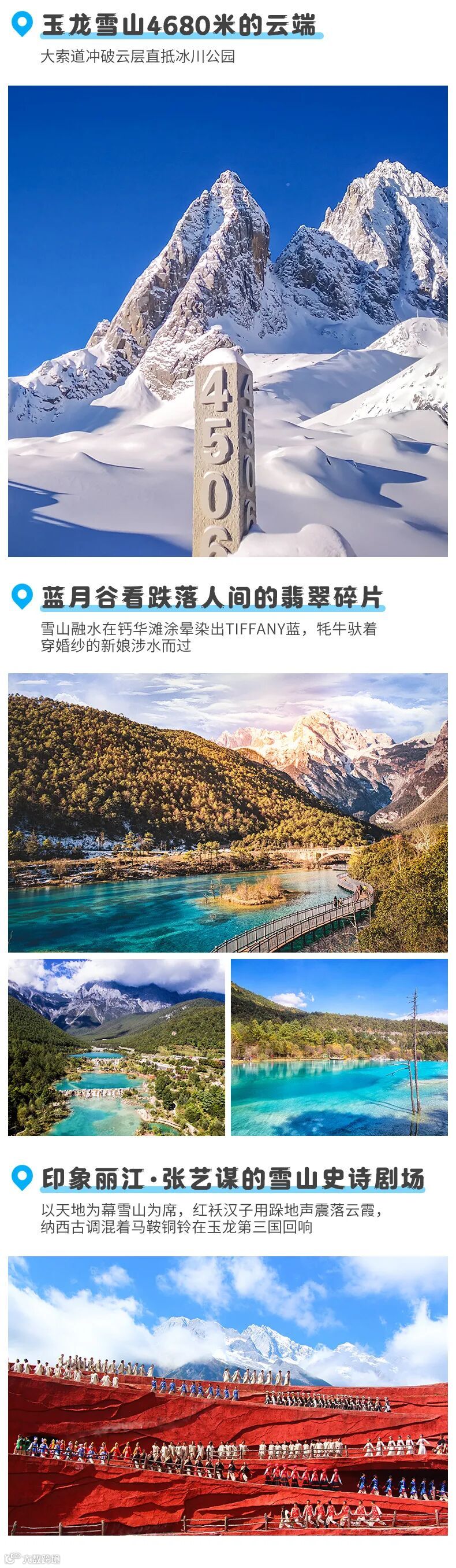 2、玉龙雪山行程为参考行程,玉龙雪山大索道时间是随机的(索道时间由索道公司出票时间为准),没办法准确控制在几点哦。