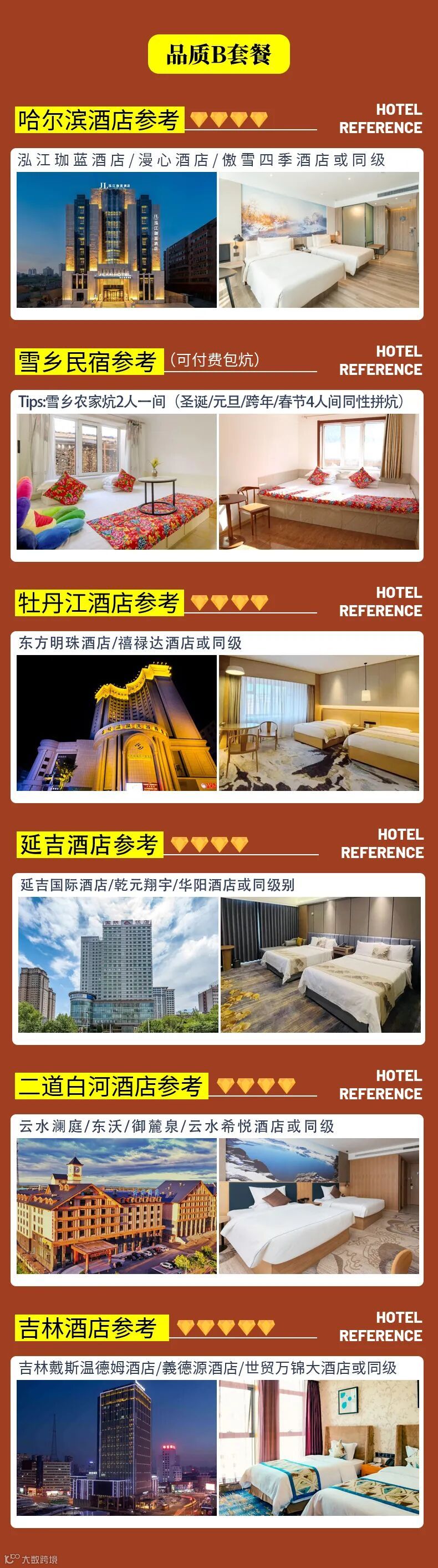 1.2米以下为儿童,含车位费、雪乡炕位、滑雪、赠送项目、保险、免门票、免早餐,不含酒店住宿、不含雪地漂流,不含温泉正常1.2米以下免票如遇收费自理;超高但未满12周岁需补门票440元+温泉100元/次+早餐费190元;如需占床需补床位费5晚酒店1250元/人含早餐含温泉,1晚农家炕如想单住请现询客服。 |