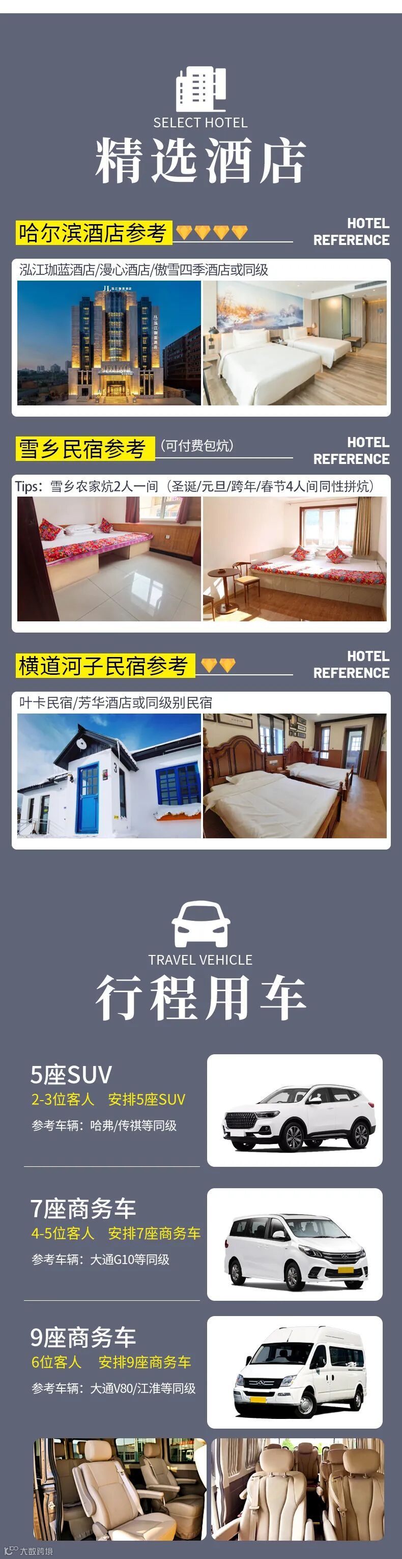 1.2米以下为儿童,含车位费、雪乡炕位、滑雪、赠送项目、保险、免门票、免早餐,不含酒店住宿;超高但未满12周岁需补门票72元+早餐费60元;如需占床需补床位费2晚酒店 700元/人,1晚农家炕如想单住请现询客服 私家团费用说明: · 2人起天天发团,司机兼管家,如逢单数报名产生空床位需补单房差 · 雪乡2人一间炕(包括圣诞/跨年/元旦/春节团期) · 包含解散日或隔天统一送机 · 2-3客人用5座SUV,4-5客人用7座商务车,6客人用9座商务车,7-8客人用大九座商务车,9-12客人用15-18座旅行巴士,保证百分之二十空座率。(如用15座及以上车型每日行程时间会比小型商务车增加1-3小时不等,望您悉知。) 优惠团期补800元/人(包含雪乡炕位升级),如产生空床位需要补单房差1500元(400+300+800) 平价团期补1000元/人(包含雪乡炕位升级),如产生空床位需要补单房差2100元(500+600+1000) 正价团期补1200元/人(包含雪乡炕位升级),如产生空床位需要补单房差2500元(600+700+1200) 元旦/圣诞/跨年团期如需升级酒店请现询客服。 春节团期如需升级酒店请现询客服。 升级参考酒店如下: 哈尔滨市:参考施柏阁酒店或皇冠假日或新巴黎酒店或同级5钻酒店 雪乡:参考雪筑遇见/纳山纳雪/雪韵假日/万嘉森林或同级别4钻轻奢民宿 横道河子民宿:与散拼团同标准,补差价不含这一晚费用 |