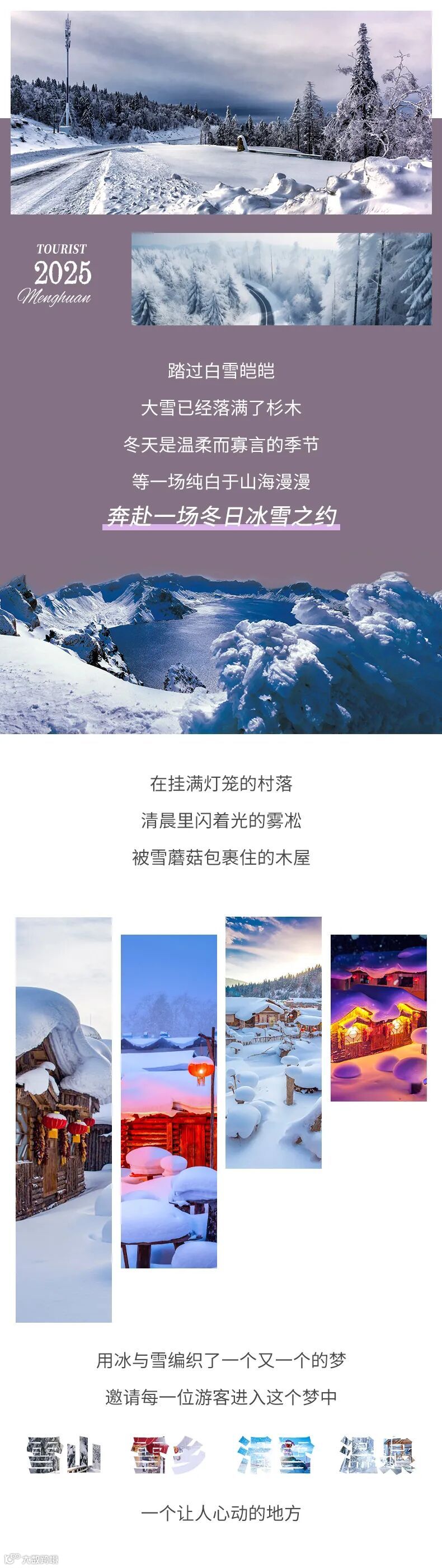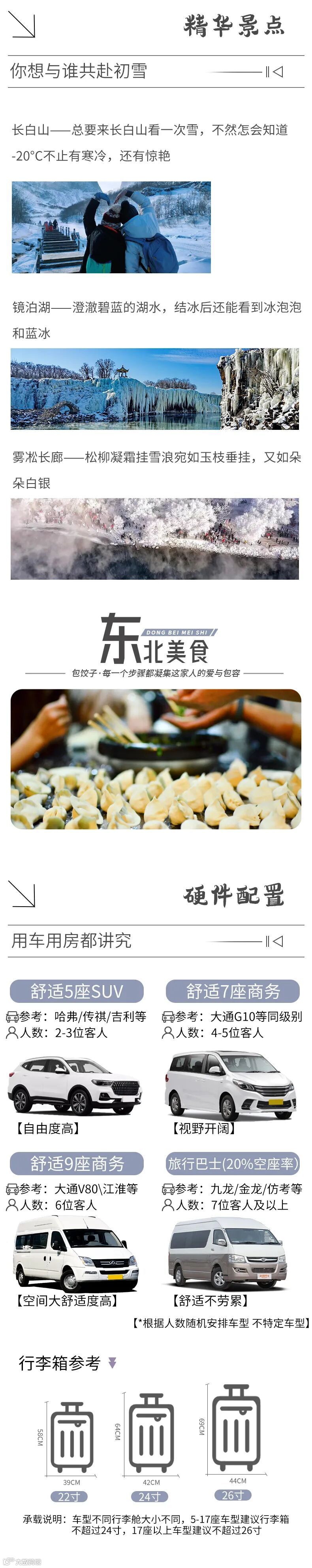 4.门票:吉林万科松花湖滑雪票(初级雪道3小时包含雪鞋雪板雪杖使用)、雪乡门票(含往返环保车)、长白山门票(含往返环保车、区间车、倒站车)、漂流门票;
