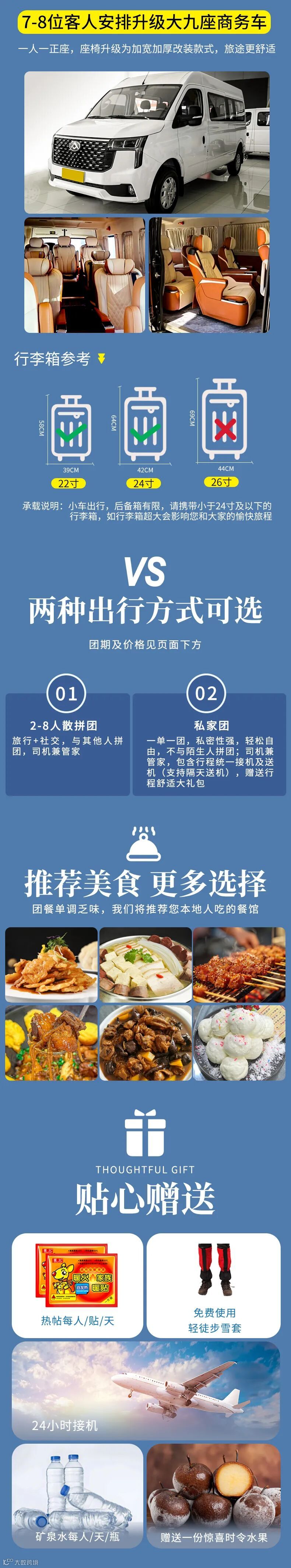 3、用车:2-3客人用5座SUV,4-5客人用7座商务车,6客人用9座商务车,7-8客人用大九座商务车,根据人数安排用车大小,不指定用车(小团副驾驶及前后座位置需要轮流乘坐,望悉知)