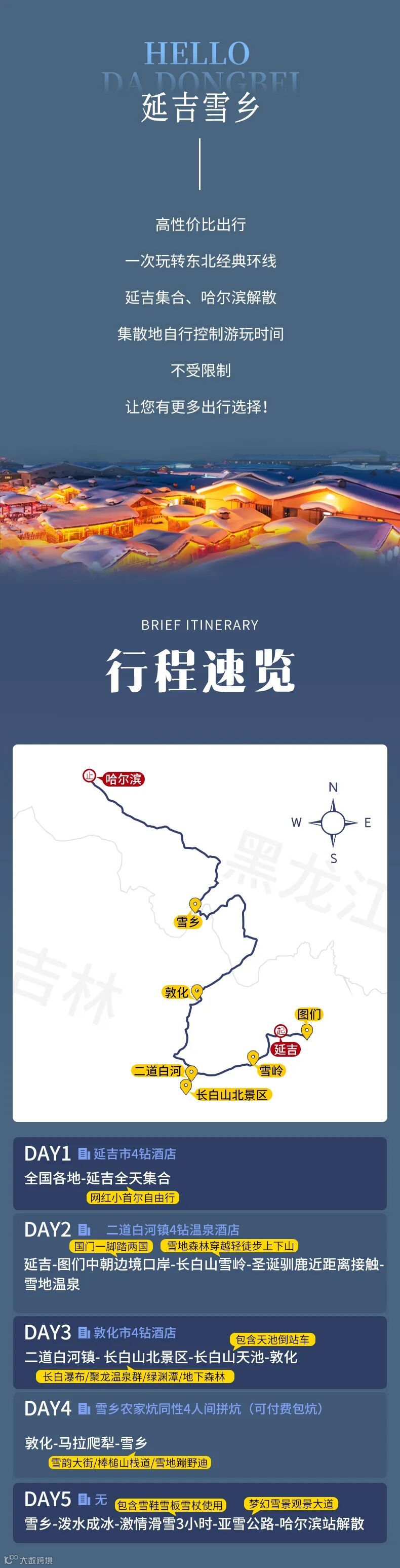 1.2米以下为儿童,含车位费、雪乡炕位、滑雪、赠送项目、保险、免门票、免早餐,不含酒店住宿,不含温泉正常1.2米以下免票如遇收费自理;超高但未满12周岁需补门票409元+温泉100元/次+早餐费100元;如需占床需补床位费3晚酒店800元/人含早餐含温泉,1晚农家炕如想单住请现询客服 费用说明: · 2人起天天发团,司机兼管家,如逢单数报名产生空床位需补单房差 · 雪乡2人一间炕(包括圣诞/跨年/元旦/春节团期) · 包含集合日或提前一天统一接机,解散日或隔天统一送机· 赠送行程舒适礼包(一次性拖鞋、不限量矿泉水、时令水果、零食等) · 其他未做特殊说明和散拼团费用包含一致 优惠团期补1000元/人(包含雪乡炕位升级),如产生空床位需要补单房差1700元(400+300+1000) 平价团期补1100元/人(包含雪乡炕位升级),如产生空床位需要补单房差2150元(450+600+1100) 正价团期补1300元/人(包含雪乡炕位升级),如产生空床位需要补单房差2550元(550+700+1300) 元旦/圣诞/跨年团期如需升级酒店请现询客服。 春节团期如需升级酒店请现询客服。 升级参考酒店如下: 雪乡:参考雪筑遇见/纳山纳雪/雪韵假日/万嘉森林或同级别4钻轻奢民宿 敦化市:与散拼团同为4钻酒店标准,补差价不含这一晚费用 |