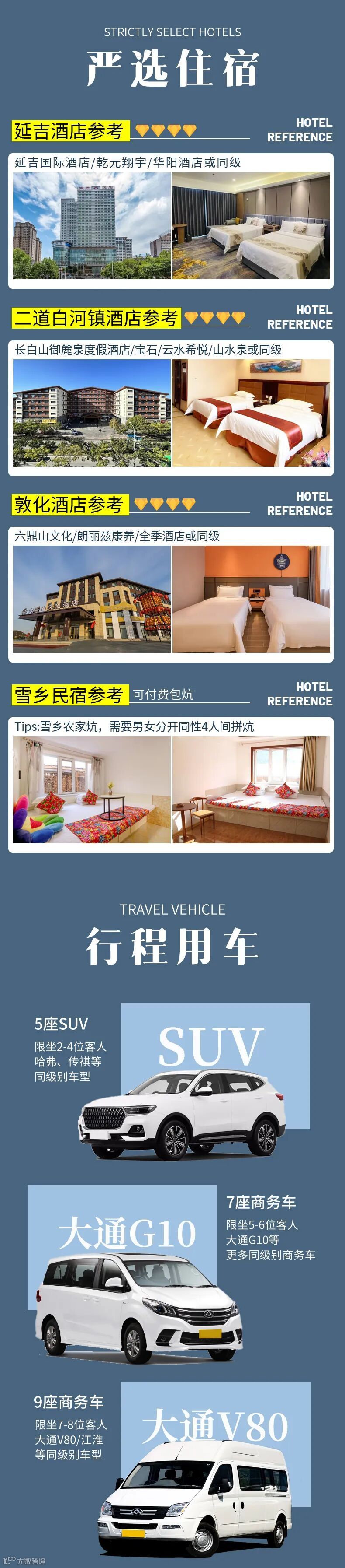 1、住宿:延吉市4钻酒店标间1晚,二道白河镇4钻温泉酒店标间1晚,敦化市4钻酒店标间1晚,雪乡4人间独立卫浴农家炕1晚(男女分开4人间拼炕)