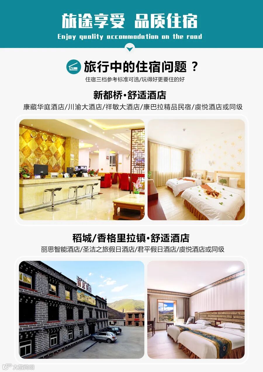2、住宿:全程4晚干净舒适酒店(独立卫生间、WIF、热水、电热毯,藏区条件有限,不能和城市相比);