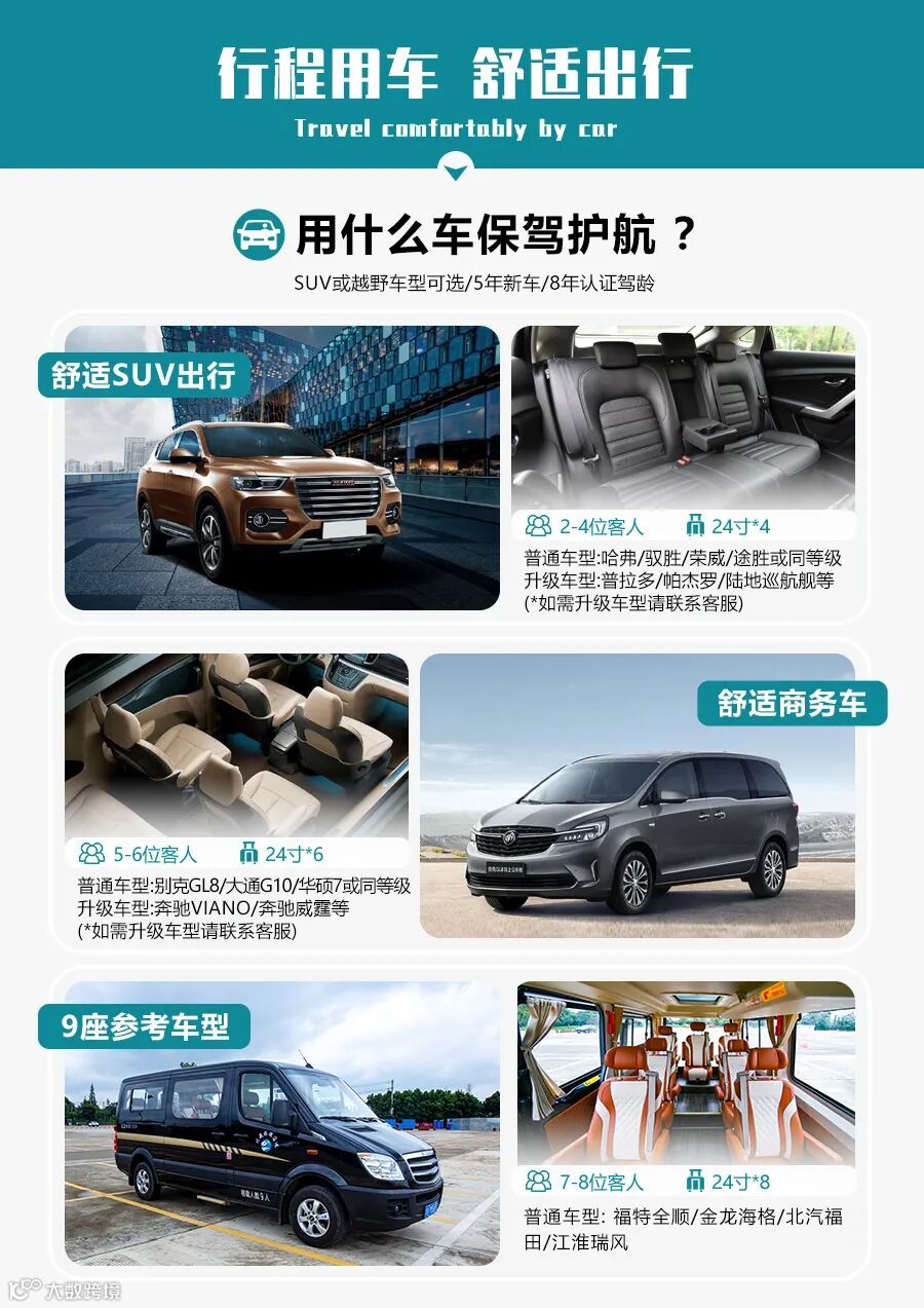 1、交通:成都出发往返交通费用(一人一座),每车不超过8位游客(1-4位游客安排5座SUV,5-6位游客安排7座商务车,7-8位游客安排9座商务车);