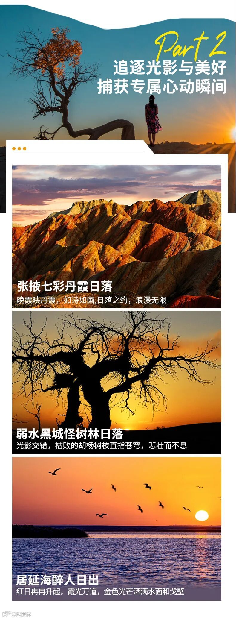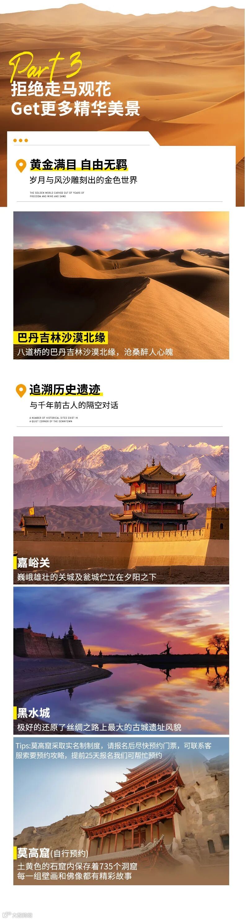 4、门票:七彩丹霞+环保车、弱水金沙湾(包含黑水城、怪树林)、额济纳胡杨林+景交车+八道桥景区、居延海门票、金塔胡杨林门票、嘉峪关关城门票、鸣沙山月牙泉