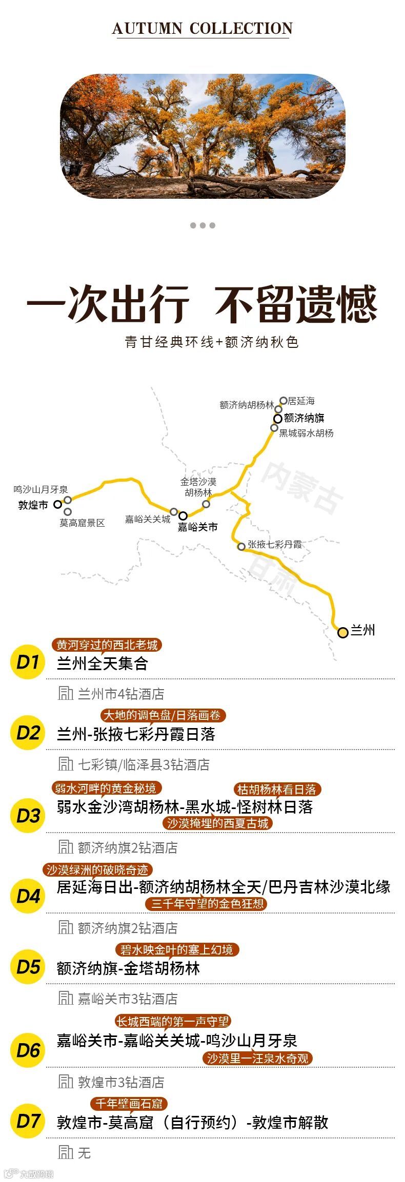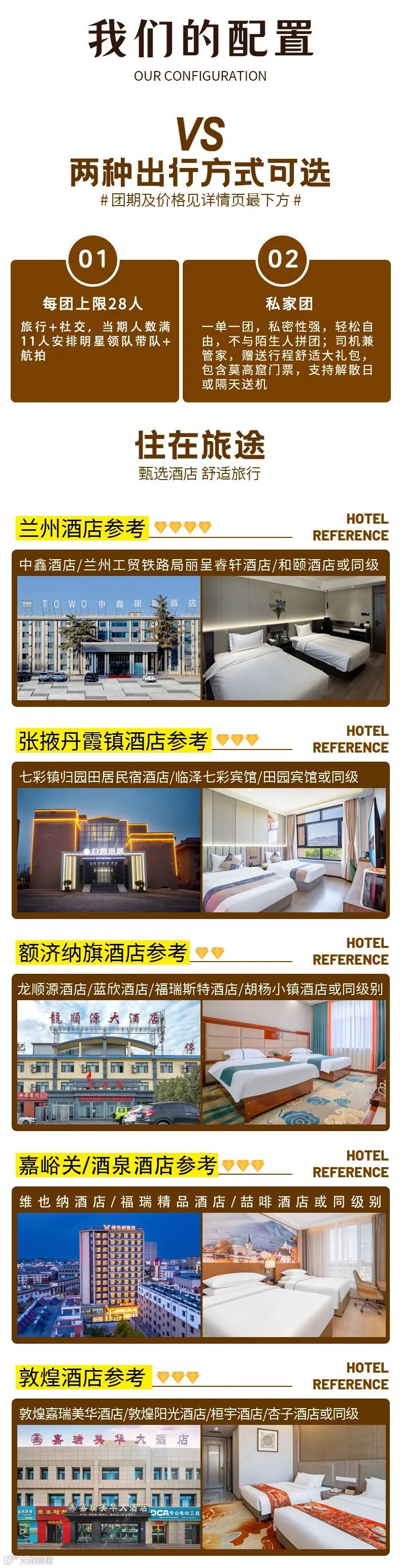 1、住宿:兰州4钻酒店标间1晚、临泽或七彩镇3钻标间1晚、额济纳旗2钻酒店标间2晚、嘉峪关3钻酒店标间1晚、敦煌市3钻酒店标间1晚、