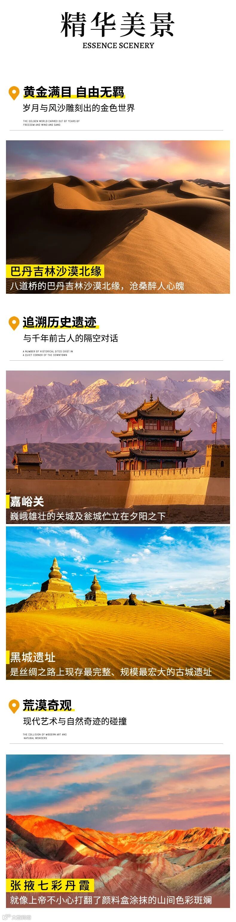 4、门票:弱水金沙湾(包含黑水城、怪树林)、居延海门票、额济纳胡杨林+景交车+八道桥景区、金塔胡杨林门票、嘉峪关关城门票、七彩丹霞+环保车;