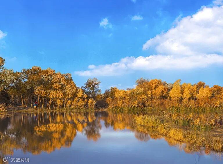 13:00 到达【金塔胡杨林】,和我们后天前往的额济纳胡杨相比,这里的胡杨林面积相对小一些,但是平添一分秀丽;这里也是树荫遮天,林中有一个不大不小的金波湖,金色的胡杨倒映在湖面上美不胜收,远处也有起伏的沙漠和椰枣林。