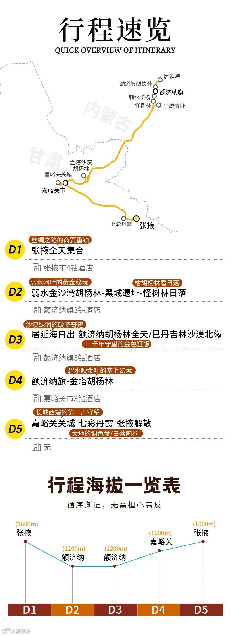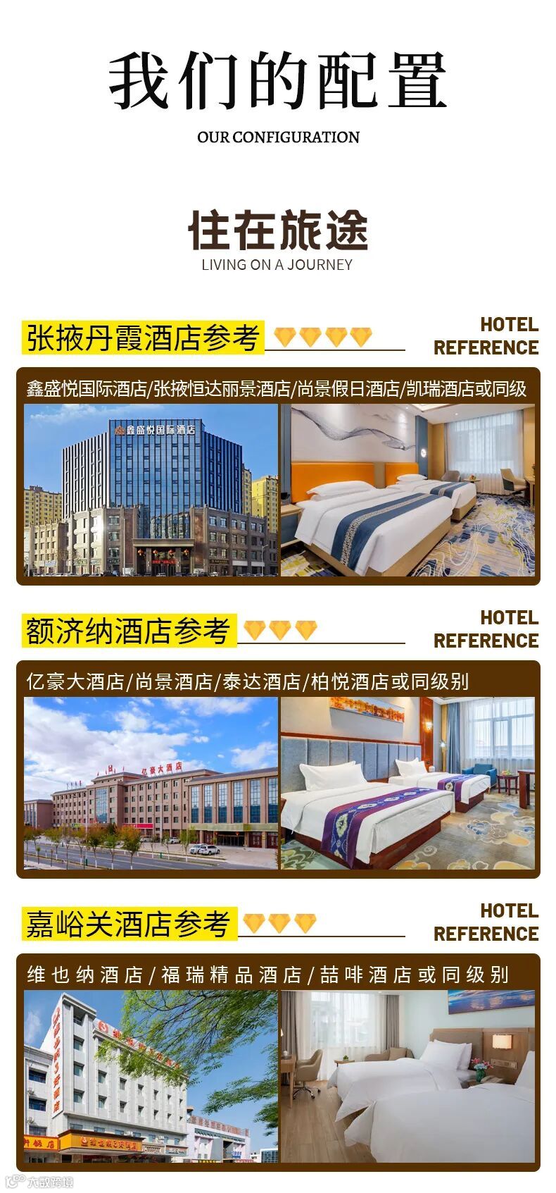1、住宿:张掖4钻/星酒店标间1晚、额济纳旗3钻/星酒店标间2晚、嘉峪关3钻/星酒店标间1晚