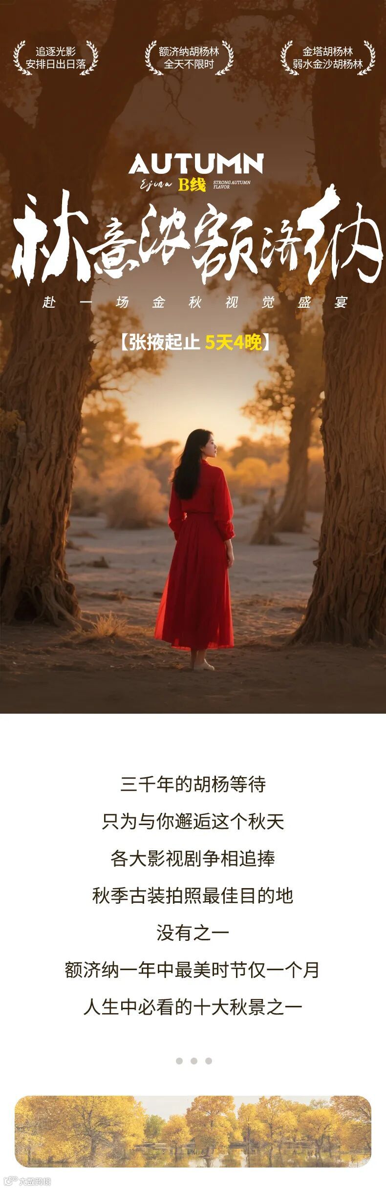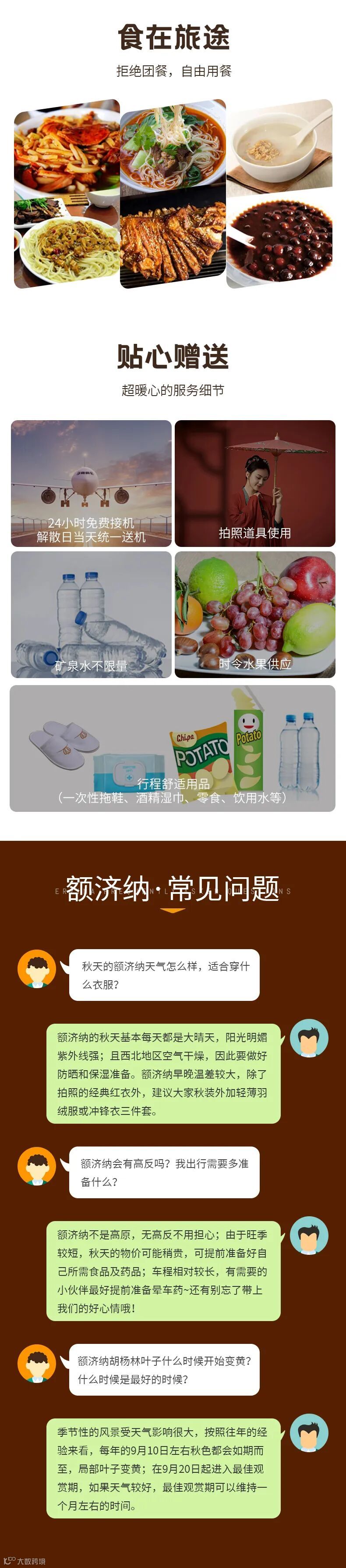 3.我们为各位购买的是额济纳胡杨林通票,包含景点:陶来林、恋影林、二道桥塔王府、倒影林、三道桥红柳海观景平台、四道桥英雄林、五道桥胡杨民俗风情园、七道桥梦境林、太阳湖、八道桥巴丹吉林沙漠北缘,大家在自由活动期间可以随意畅玩!
