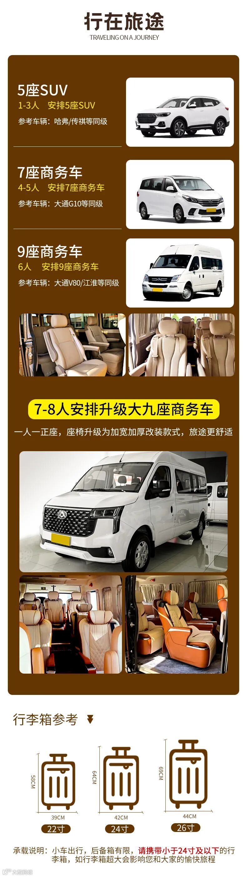 3、用车:2-3人用5座SUV,4-5人用7座商务车,6人用普通9座商务车,7-8人用改装大九座商务车,9人及以上根据人数安排商务车,保证百分之二十空座率。