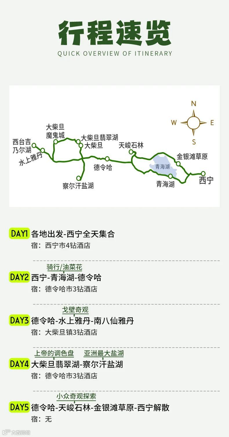 德令哈-(220km,约3.5h)天峻石林-(200km,约3h)金银滩草原-(120km,约2h)西宁解散