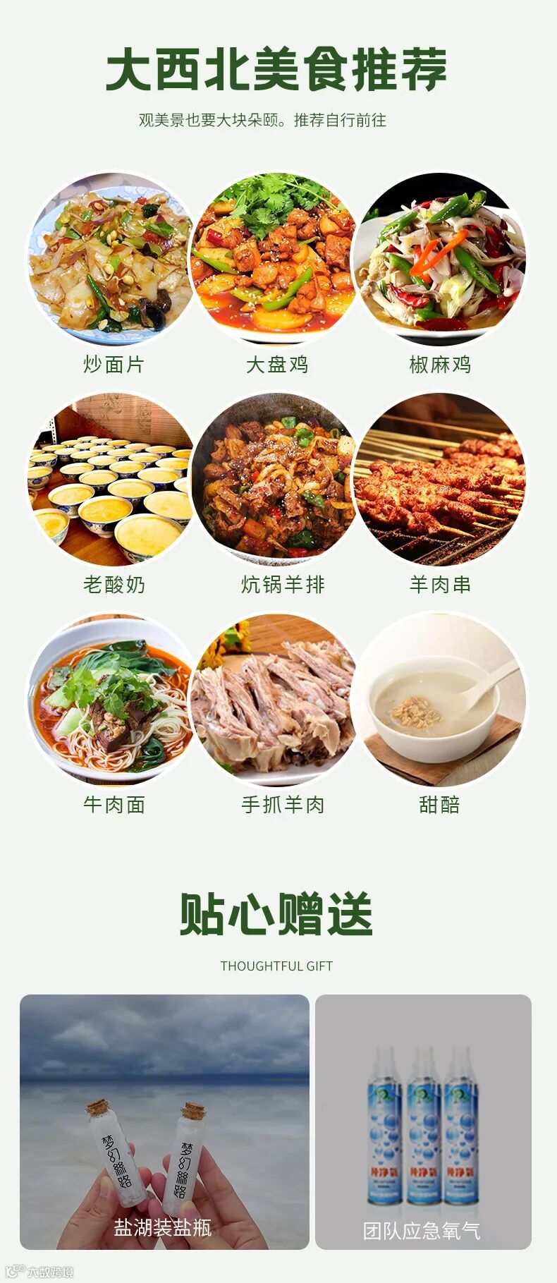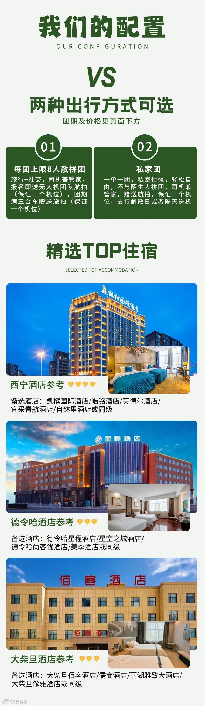 1、住宿:西宁市4钻酒店标间1晚、德令哈市3钻酒店标间2晚、大柴旦镇3钻酒店标间1晚