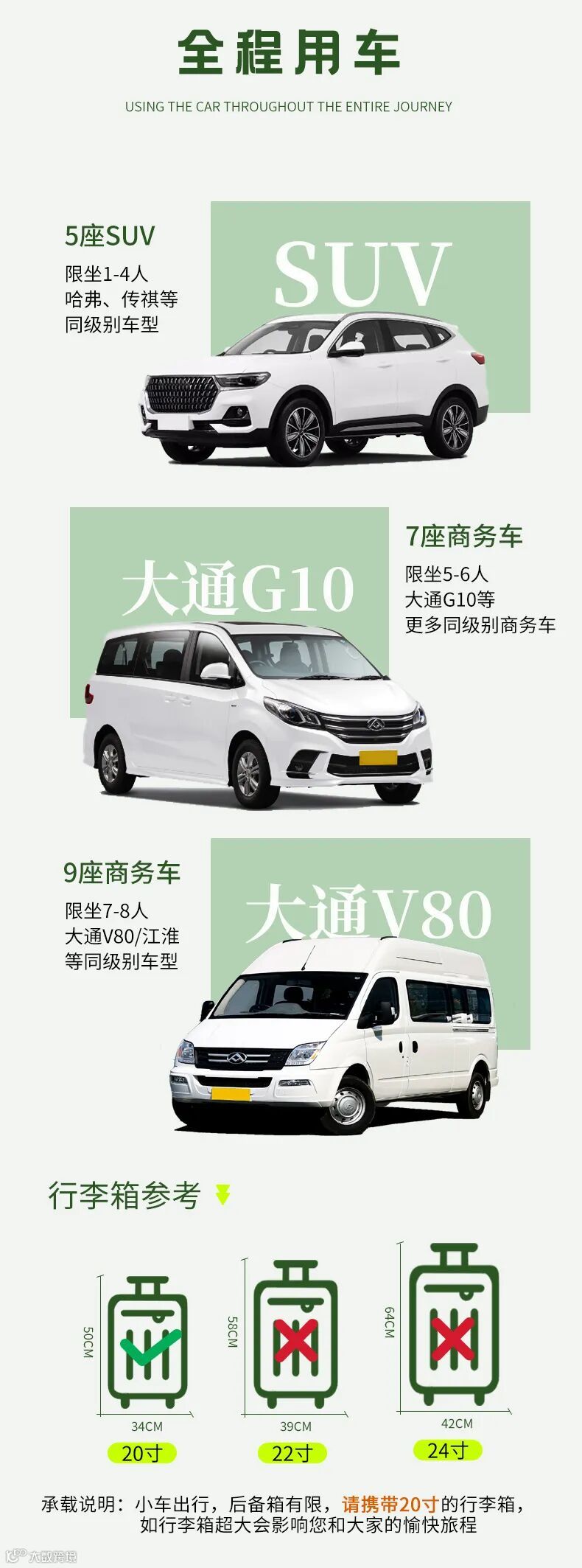 3、用车:2-4人用5座SUV,5-6人用7座商务车,7-8人用9座商务车(小团副驾驶及前后座位置需要轮流乘坐,望悉知)