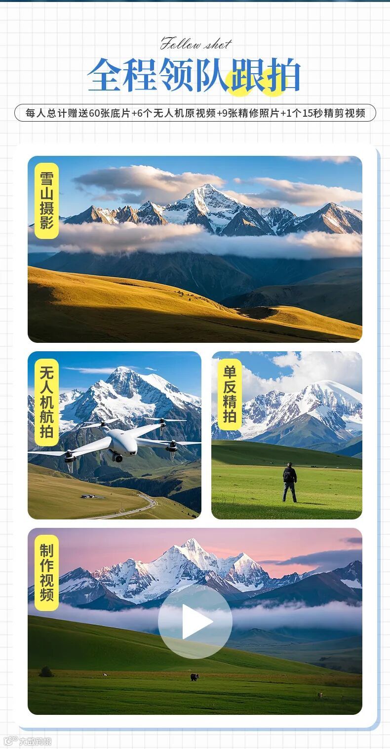 5、旅拍:每人总计赠送60张底片+6个无人机原视频+9张精修照片+1个15秒精剪视频(精修照片和精剪视频完团后7天内交付,若交付数量不够,每差一张底片赔付5元,每差一张精修照片赔付10元,每差一个视频赔付30元)(注:如果出现堵车、自然灾害、天气极差等不可抗力因素或者游客本身不想拍摄等情况,我社尽量在后面行程中补上,但是对当天拍摄数量不做赔偿。);