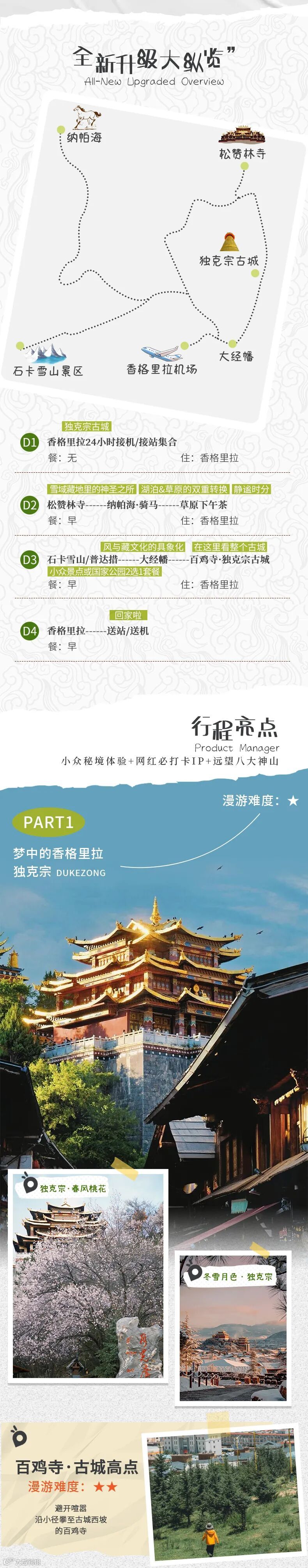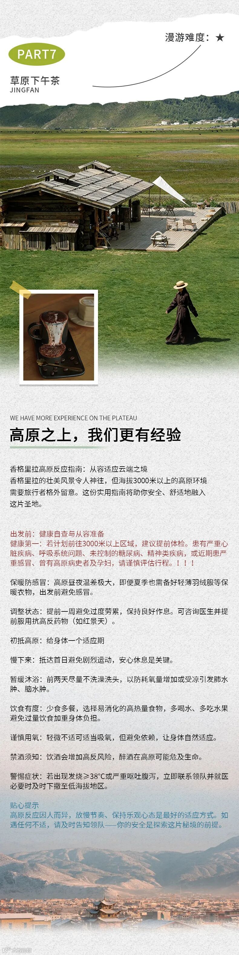 1、香格里拉地区为高原高海拔,大家在游览时,注意步速,登高时注意呼吸;