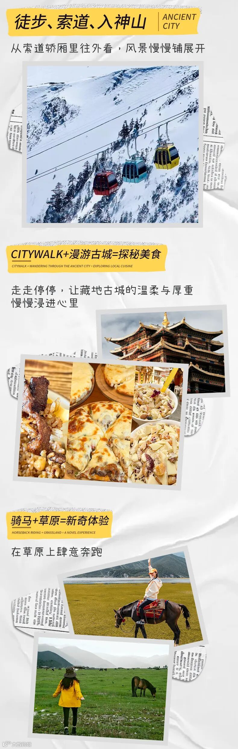 A套餐 10:00 抵达【石卡雪山】,缆车攀升,将你送入云端秘境。俯瞰香格里拉盆地如巨幅唐卡展开,冷杉林在脚下绵延。行走于海拔4500米的栈道,触手可及的流云与嶙峋山岩共舞,这里是众神的花园,亦是离天堂最近的散步场。行动放缓,谨防高反;瞬息万变的天气是常态。