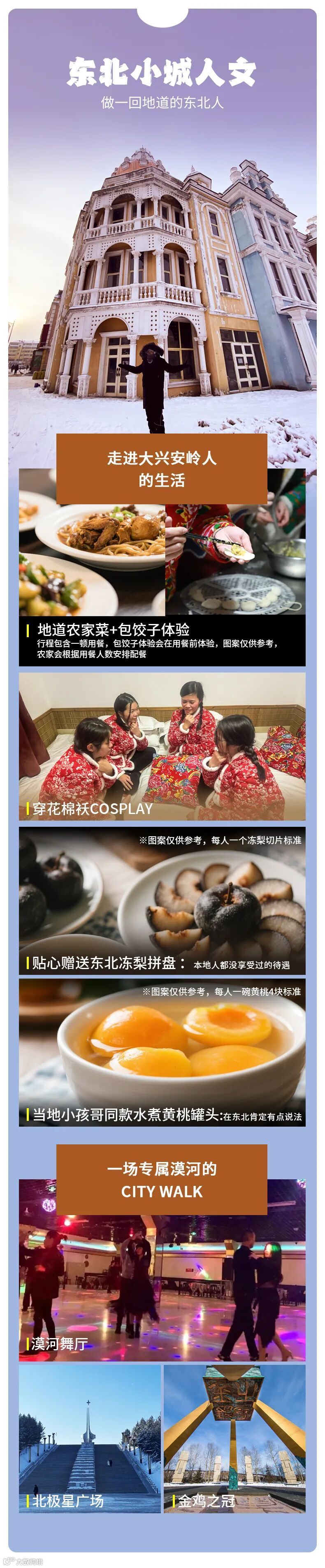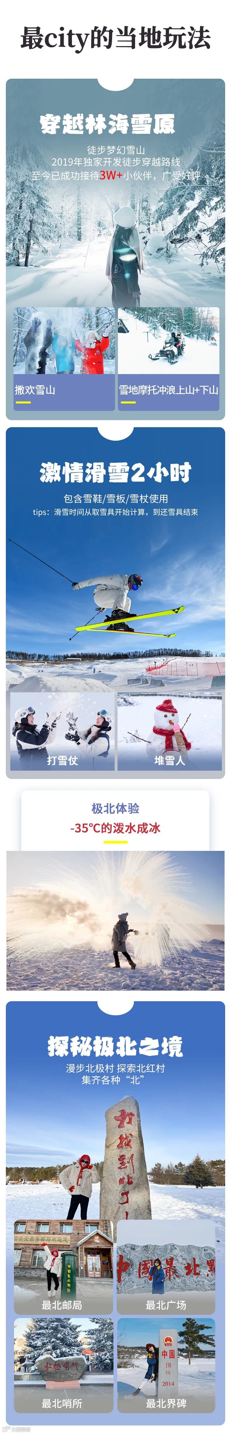 4、门票:雪乡门票+往返环保车、梦幻雪山门票、龙江第一湾门票、圣诞村门票、漠河2小时滑雪(包含雪鞋雪板雪杖)、北极村门票、鄂温克驯鹿园;