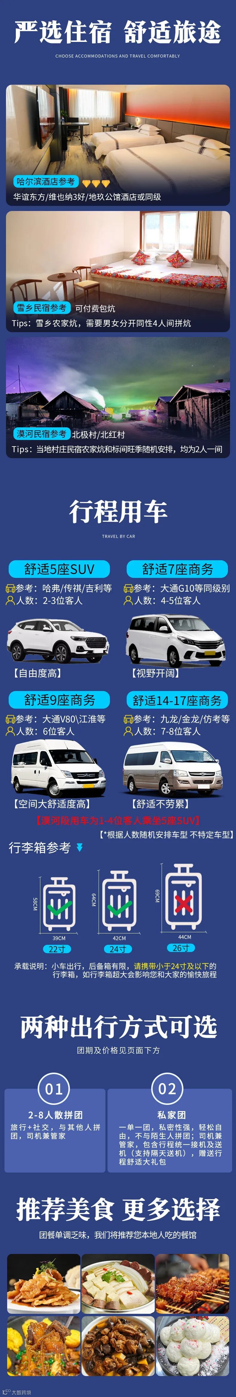 · 私家团漠河段2-4客人用5座suv,5-6客人用7座商务车,7-8客人用两台suv