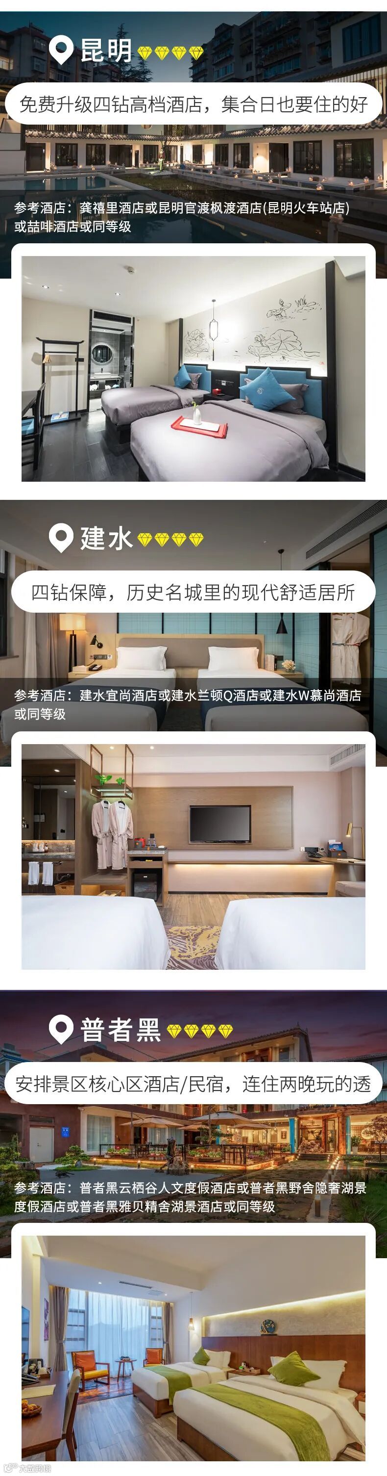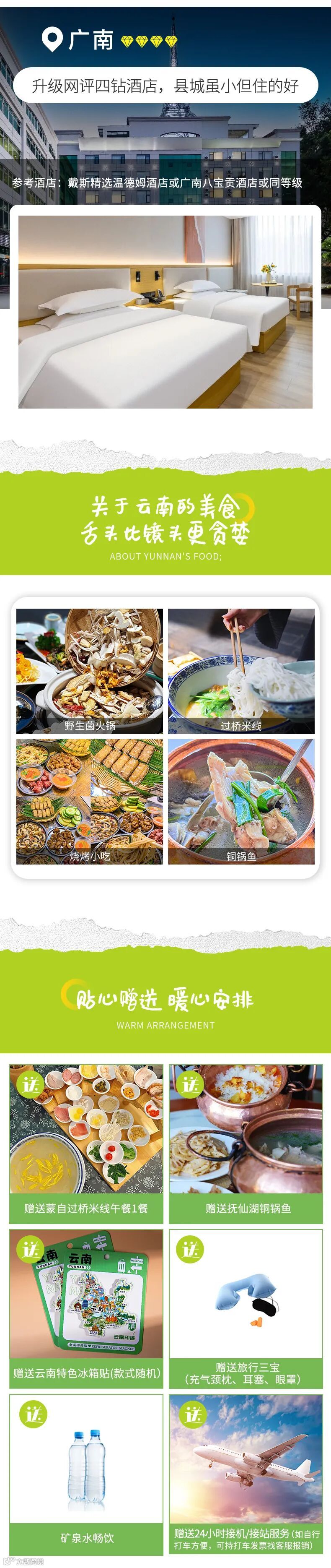 1、住宿:昆明四钻酒店1晚(参考:参考:龚禧里·禧见酒店(昆明火车站大树营地铁站店)或枫渡酒店(昆明站官渡万象城店)或同等级酒店),普者黑四钻酒店/民宿2晚(参考:普者黑云栖谷人文度假酒店或普者黑野舍隐奢湖景度假酒店或普者黑雅贝精舍湖景酒店或同等级酒店/民宿),建水四钻酒店1晚(参考:建水宜尚酒店或建水兰顿Q酒店或建水W慕尚酒店或同等级酒店),广南四钻酒店1晚(参考:戴斯精选温德姆酒店或广南八宝贡酒店或同等级酒店);