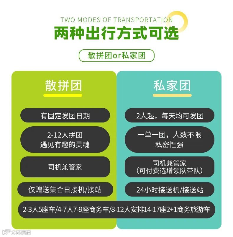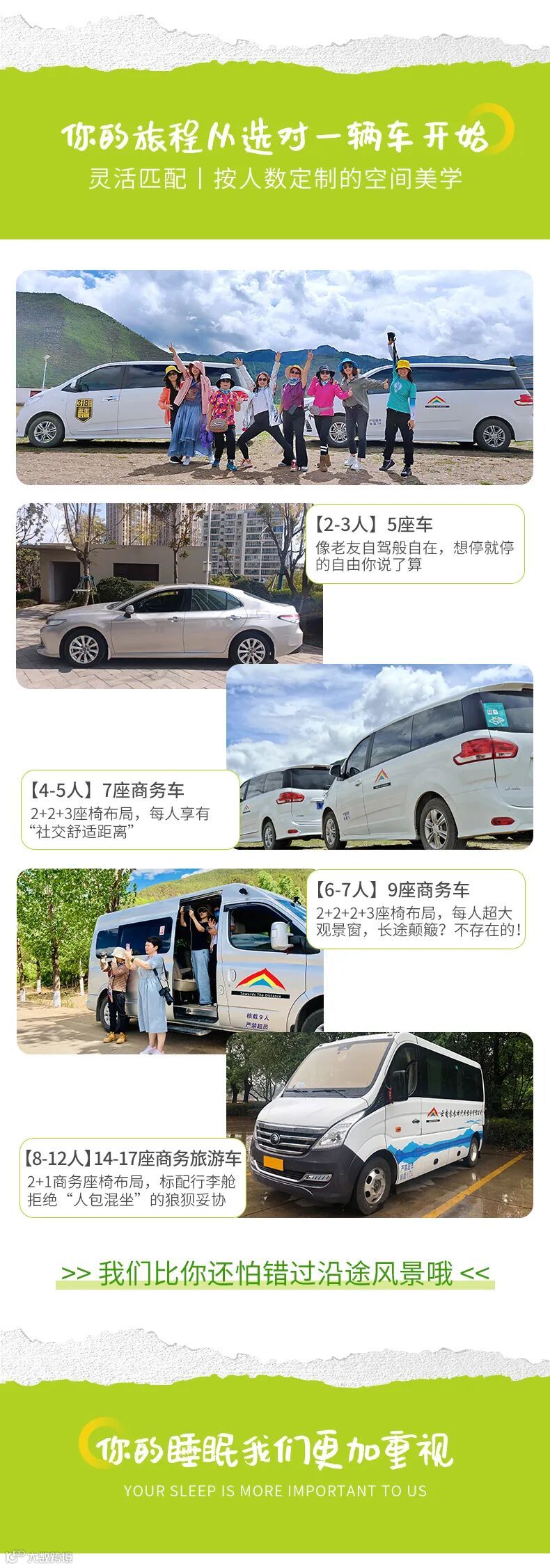 3、用车:2-3人安排5座车,4-5人安排7座商务车,6-7人安排9座商务车,8-12人安排14-17座旅游车;