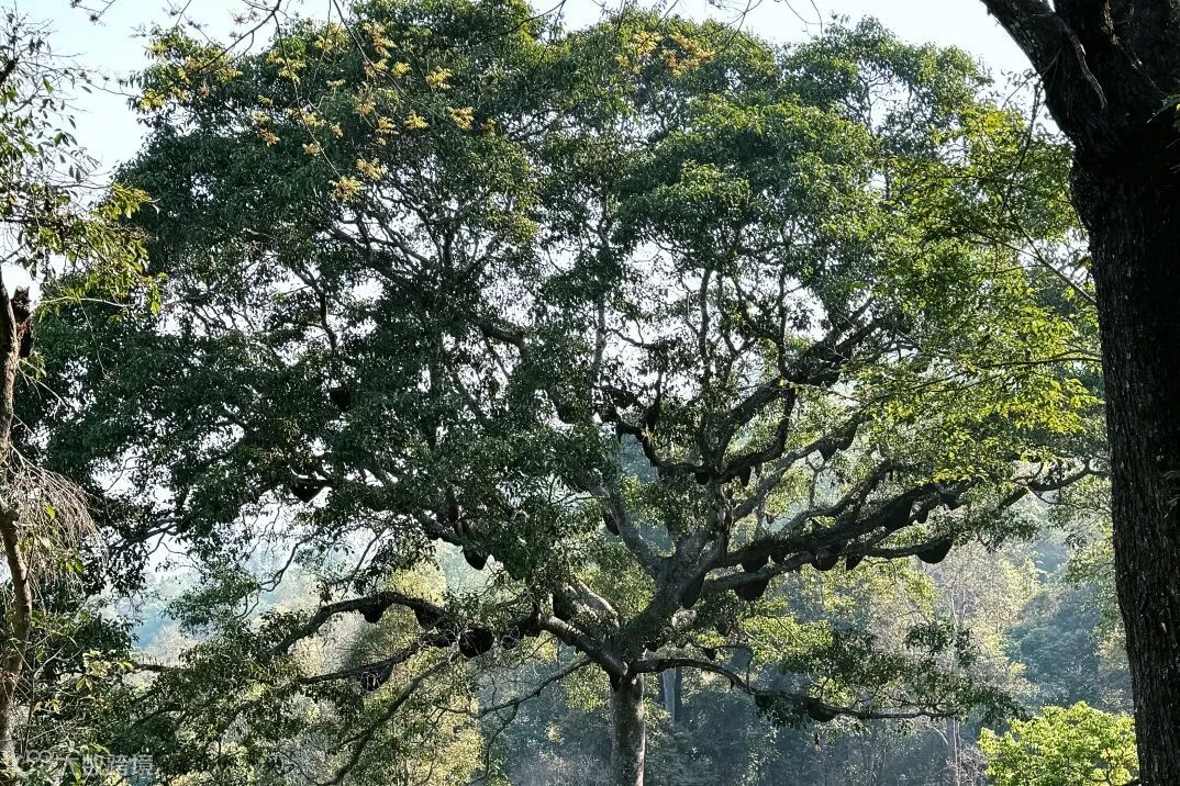 10:30 抵达【蜂王树】,一棵近50米高的古榕树,枝繁叶茂,层叠横亘的枝丫上,密密麻麻的挂着70多个蜂巢。每当二月底春茶开采的时候,近万只蜜蜂会从四面八方飞来,在蜂神树上筑巢栖息,十分壮观。