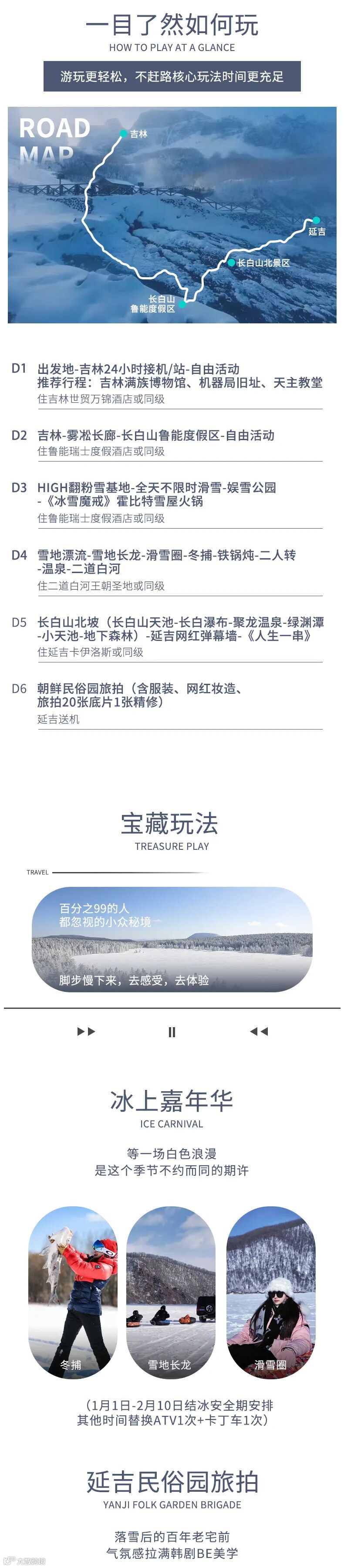 3、赠送冰雪嘉年华:雪地长龙1次、滑雪圈、冰面冬捕1次(1月1日-2月10日结冰安全期安排,其他时间替换ATV骑行1次+卡丁车1次)。