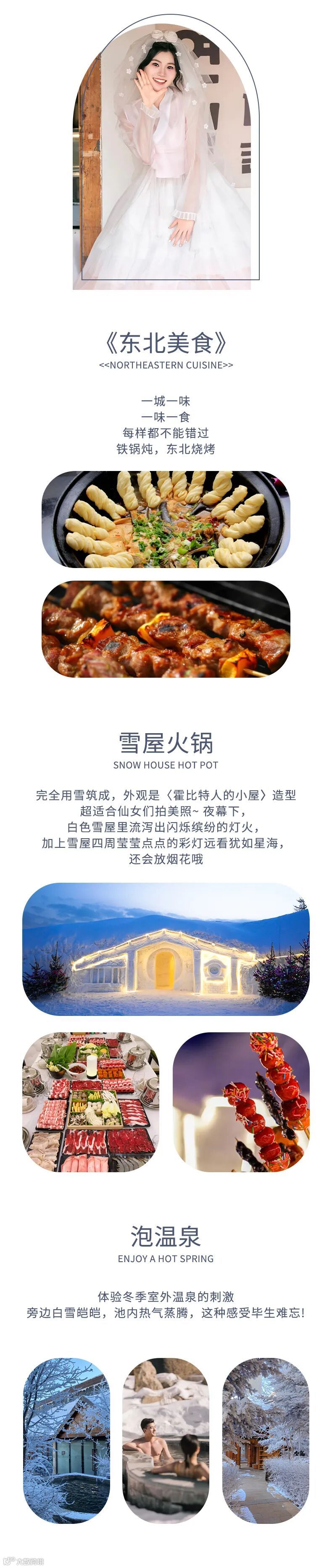 1、赠送3餐东北特色餐:东北铁锅炖、雪屋火锅、东北烧烤。