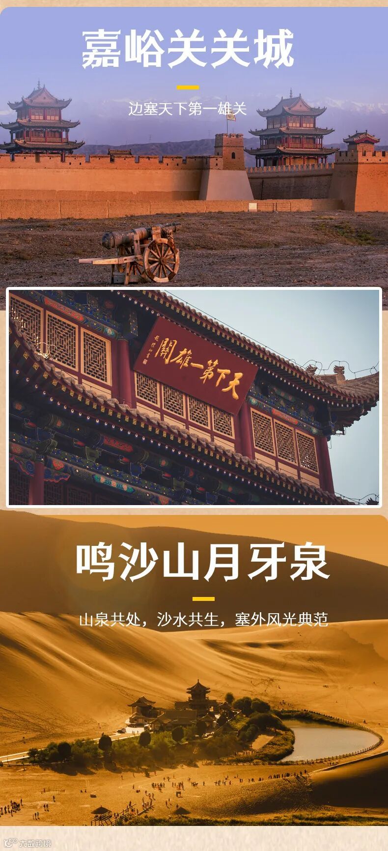 张掖-(220km,2.5h)嘉峪关关城-(370km,约5h)鸣沙山月牙泉日落-敦煌市