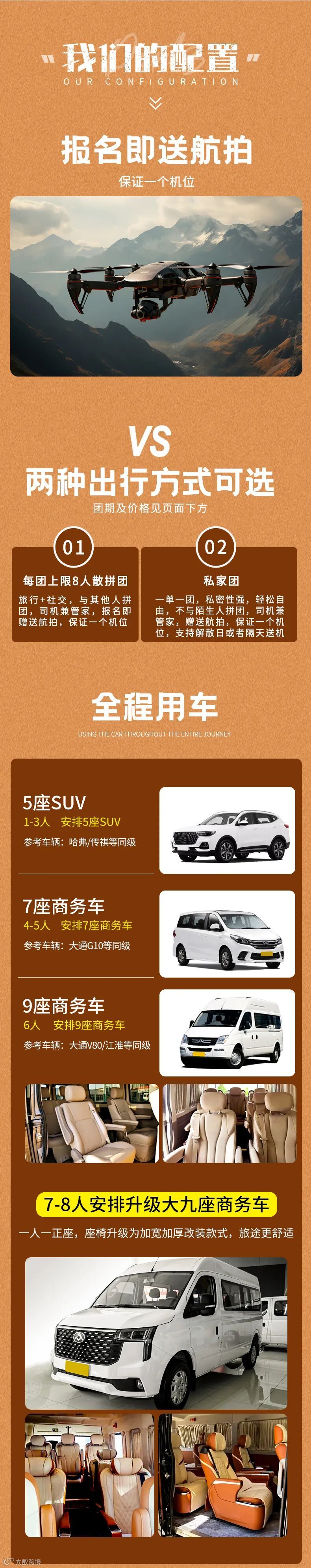 3、用车:2-3人用5座SUV,4-5人用7座商务车,6人用普通9座商务车,7-8人用改装大九座商务车(小团副驾驶及前后座位置需要轮流乘坐,望悉知)