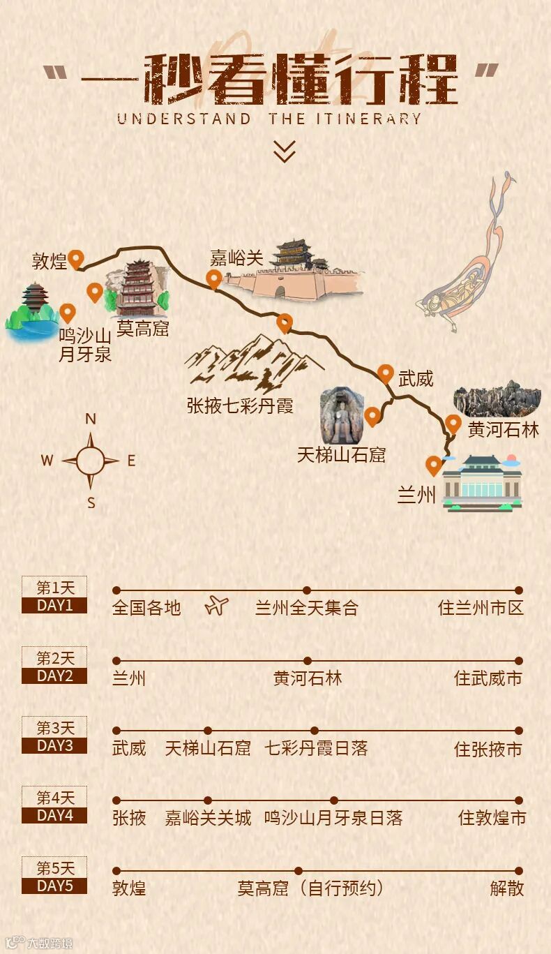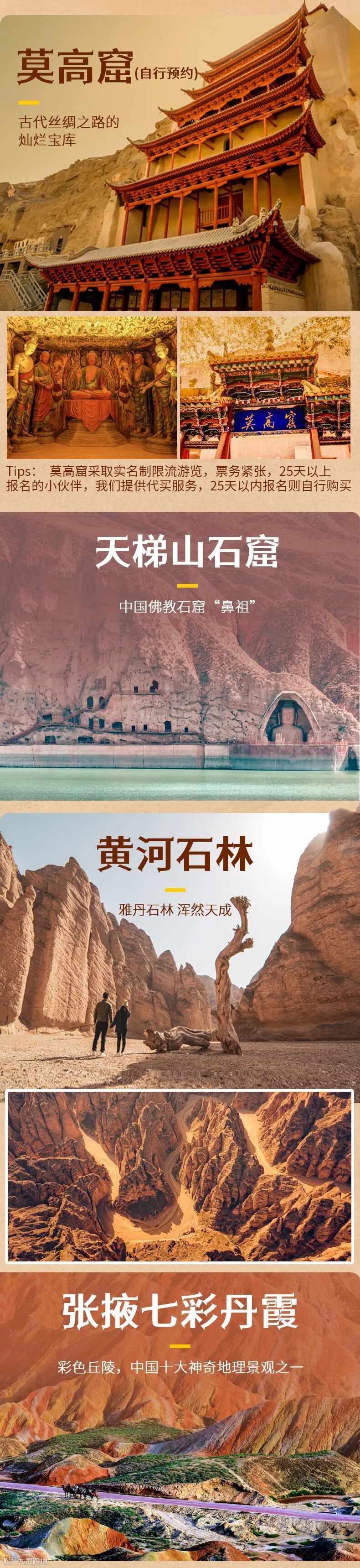 1、莫高窟的游玩时间可能根据大家抢到的门票调整为上午或者下午,难免会出现小伙伴们互相等待的情况,敬请谅解。