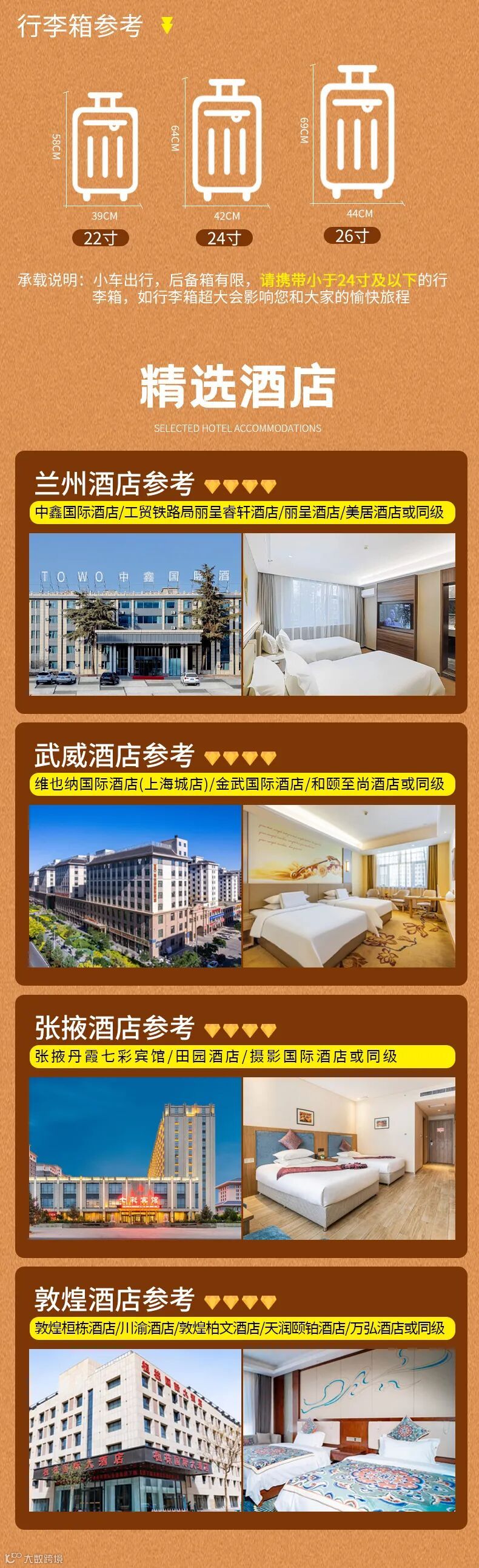 3、如果定敦煌的火车建议定18点30分以后出发的车次,敦煌的飞机建议定19点之后起飞的航班,如果您的航班需要提前或者其他原因提前离团,也可自行打车前往火车站或者机场,费用自理。