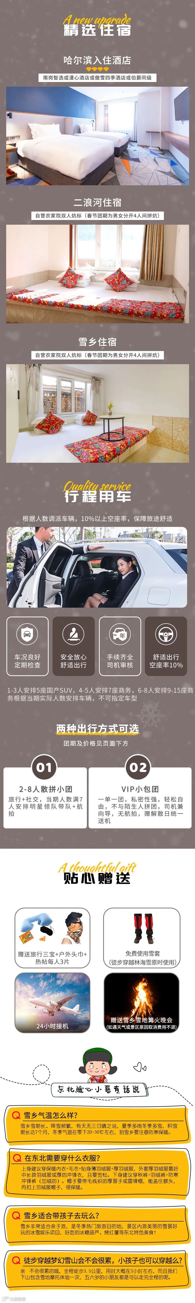 【VIP小包团活动费用】:(2人起天天发团,司机兼领队,无航拍,雪乡2人一间炕,赠送机)