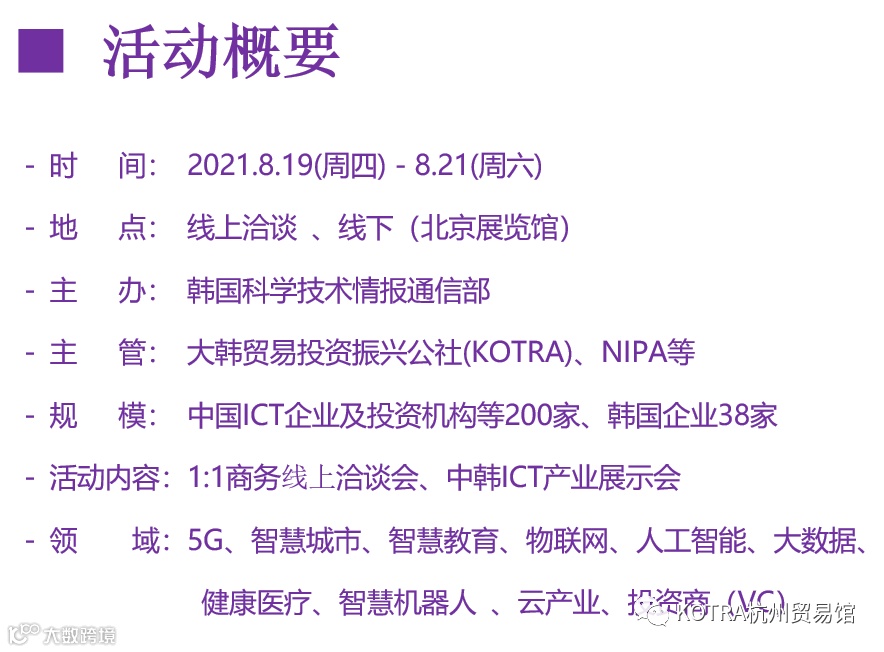 本次交流会与中国智慧城市博览会相结合开展线上线下双重模式,线上为主,线下为辅,为中韩两国企业提供贸易平台。现诚挚邀请智慧城市、文化、物联网、人工智能、大数据、5G、智能机器人、健康医疗、投资商(VC)等领域的优秀企业,踊跃参加此次“2021中韩ICT产业合作暨交流会”。