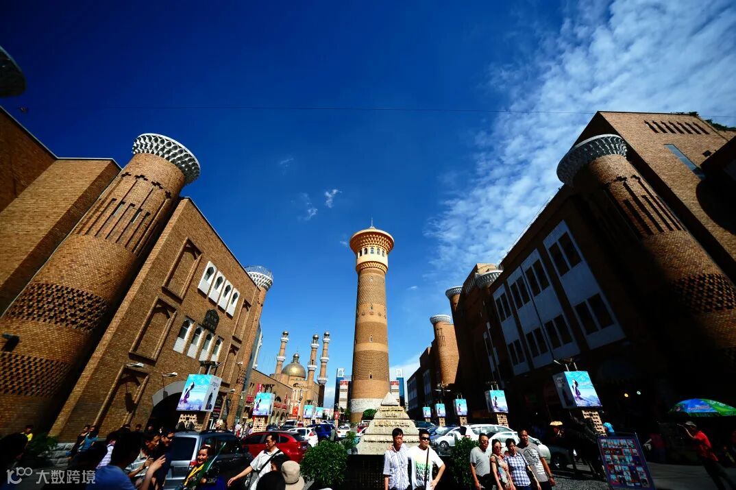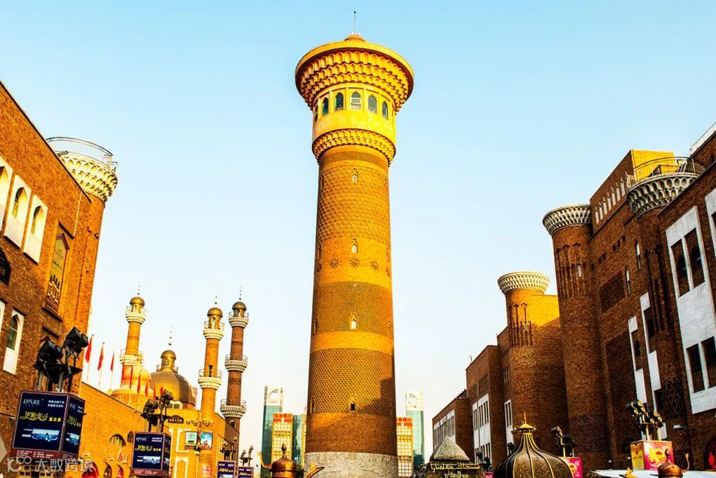 【国际大巴扎】——世界上规模最大的巴扎(巴扎为维吾尔语,意为集市)。具有浓郁的伊斯兰建筑风格,体现了浓郁的西域民族特色和地域文化,这里除了有令人眼花缭乱的商贸市场外,还有美食广场、观光清真寺、80米高的新疆第一观光塔等设施。
