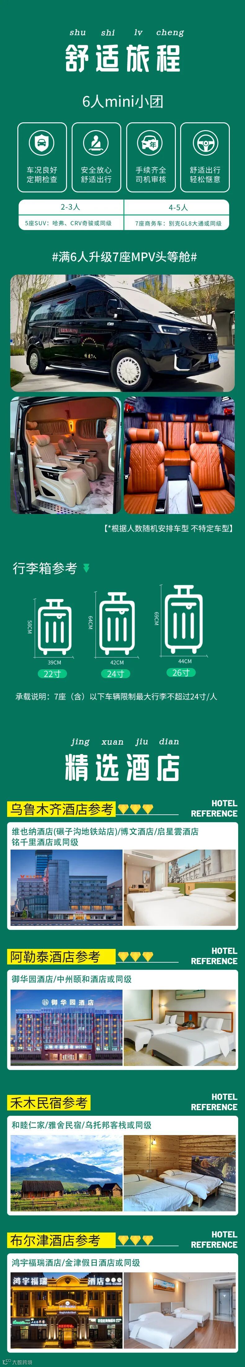 3、用车:2-3人用5座SUV,4-5人用7座商务车,6人升级大7座头等舱(小团副驾驶及前后座位置需要轮流乘坐,望悉知);