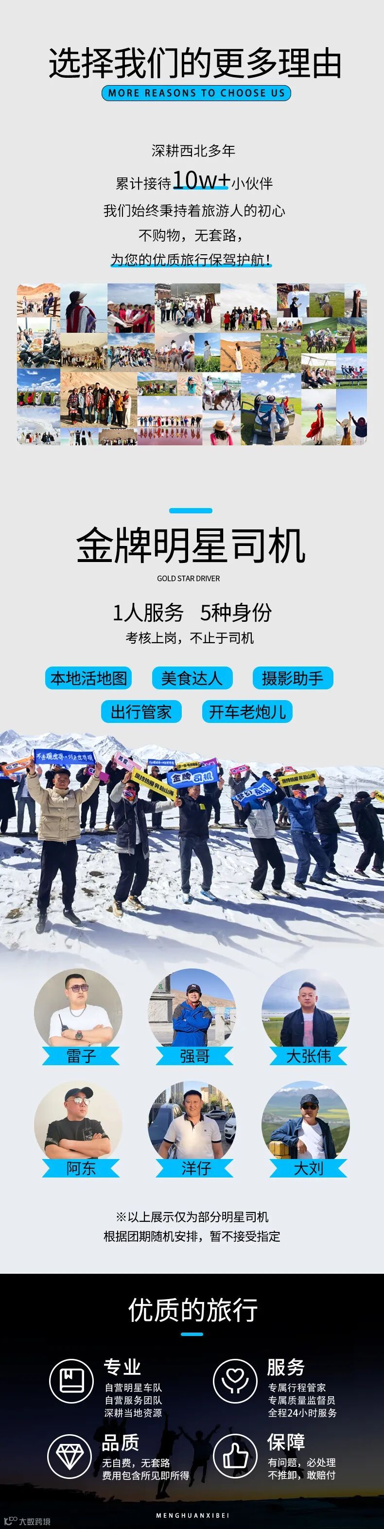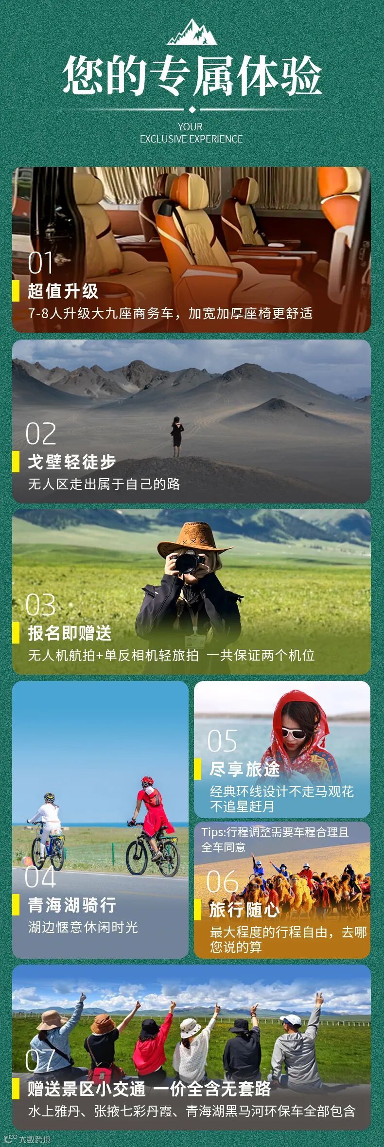 5、所有团期报名即赠送航拍+旅拍(一共保证两个机位,拼团团期和私家团团期都包含,如团期旅拍无法安排则改为赠送两个机位的航拍)