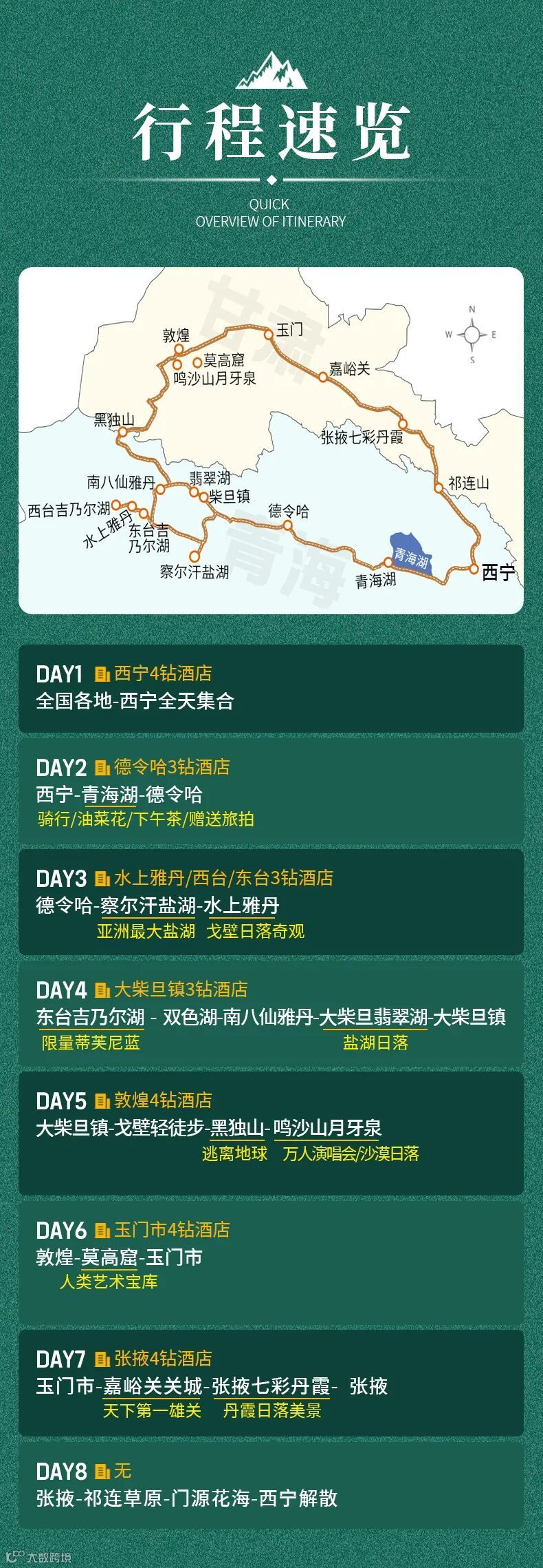 4、门票:察尔汗盐湖门票+环保车、黑马河观景台环保车、水上雅丹+环保车、大柴旦翡翠湖、莫高窟门票、鸣沙山月牙泉、嘉峪关关城、七彩丹霞+环保车