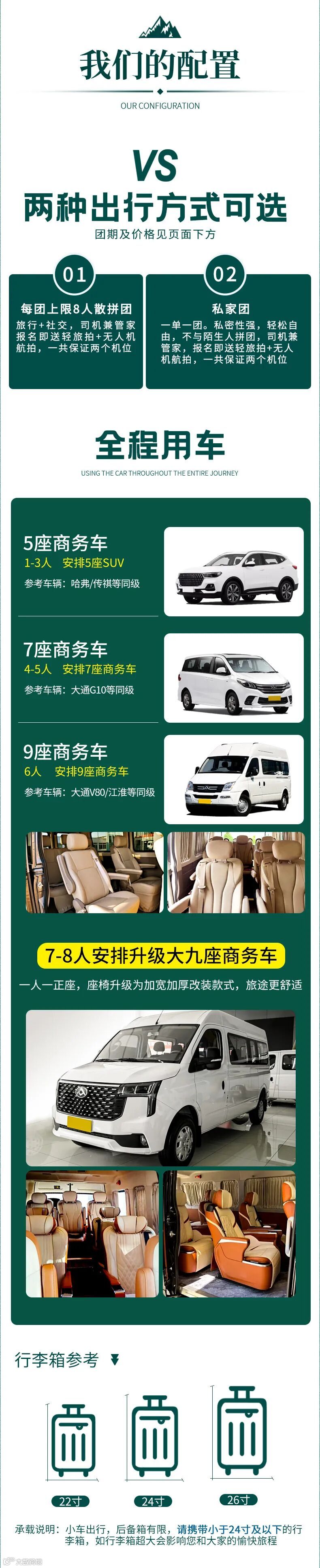 3、用车:2-3人用5座SUV,4-5人用7座商务车,6人用普通9座商务车,7-8人用改装大九座商务车(小团副驾驶及前后座位置需要轮流乘坐,望悉知)