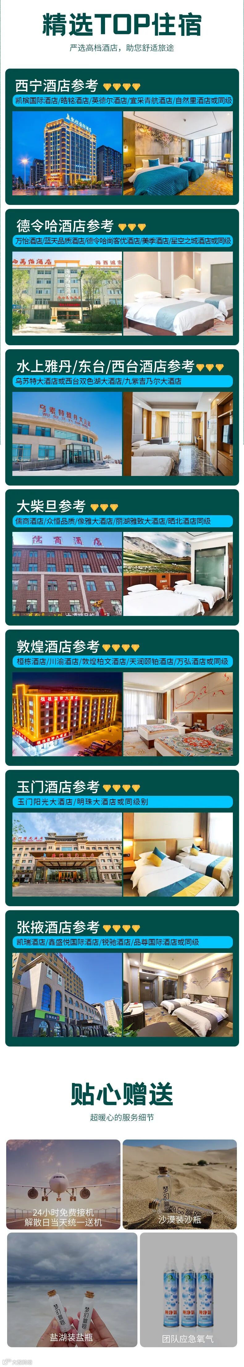 1、住宿:西宁市4钻酒店标间1晚、德令哈3钻酒店标间1晚、水上雅丹/东台/西台3钻酒店标间1晚、大柴旦镇3钻酒店标间1晚、敦煌4钻酒店标间1晚、玉门市4钻酒店标间1晚、张掖市4钻酒店标间1晚